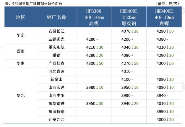 鋼廠調價:9月16日,全國累計12家鋼廠發布調價信息,整體調幅在0-50元/噸(除特別備注外,上述調整幅度及執行價格均為含稅)具體出廠價格請查詢《鋼廠資訊》欄目中《鋼廠調價信息》欄目。