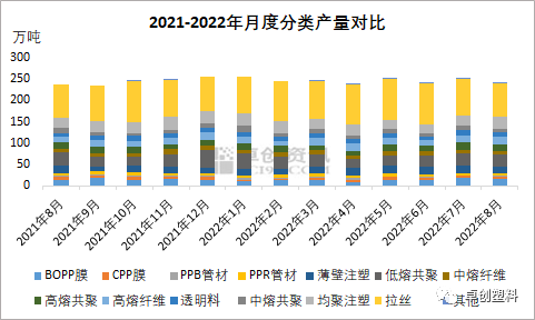 2022年8月聚丙烯市場降負和檢修裝置延續增多,月度產量環比出現縮減,對市場供應壓力相比前期有所好轉。聚焦到細分品種上,月內部分品種流通偏緊,不同品種供需情況與市場價差變化相互作用。