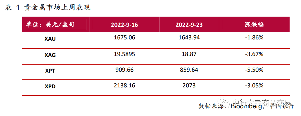 上周在美元指數和美債收益率大幅走強的背景下,各類資產普遍走低,貴金屬板塊也受到明顯壓制。黃金表現出相當韌性,全周下跌1.86%,其余品種跌幅均超過3%。