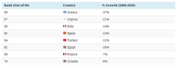 與亞洲形成對比的是,歐洲國家在過去十年中幾乎沒有增長,特別是地中海地區國家或地區。事實上,在過去十年表現最差的20個財富市場中,有8個位于地中海沿岸,比如說希臘、意大利、西班牙和土耳其等。