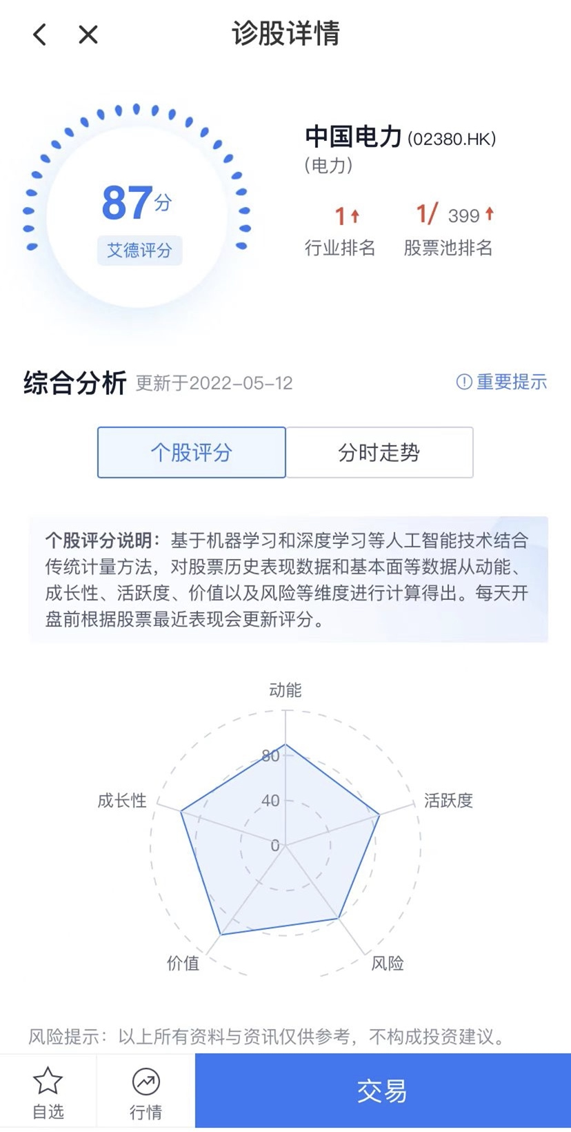 大家只需要輸入股票代碼或者簡拼,即可獲得我們對于該只個股在動能、活躍度、風險、價值及成長性等5個維度的綜合評分,并給予行業排名、股票池排名等地位信息,助大家對鐘意的股票有更全面的了解及認識。