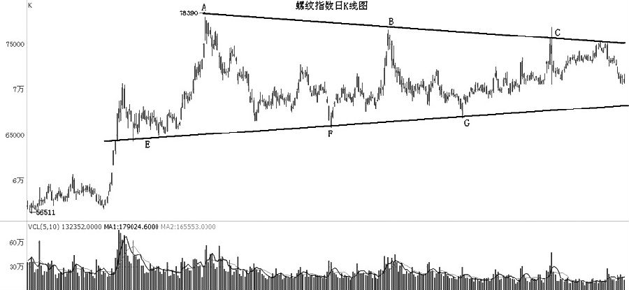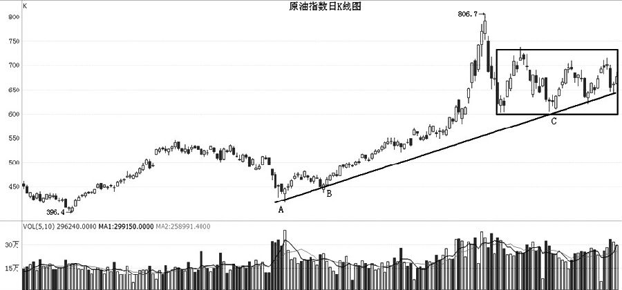 原油在3月持續沖高后急速下跌,至今始終在A、B和C組成的日線級趨勢上方振蕩。技術特征有以下幾個方面:一是A-B-C支撐線將是后市趨勢多空方向的主要依據;二是如果第一浪下跌定義為a浪,那么方框中的矩形調整區域為b浪。若后市下破支撐線則形成c浪下跌,那么未來演繹a-b-c結構調整的可能性最大;反之,原油應該就在此位置站穩延續上漲趨勢。(開元貿易 顧敏忠)