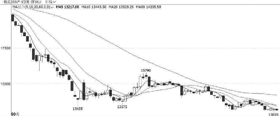 棉花2301合約近期跌至13000點一線后有所止跌,連續四個交易日收成實體很小的K線。量能方面,近期價格在13000點一線上方止跌過程中成交量處于低位,持倉量整體變化不大。指標方面,均線系統延續空頭趨勢,MACD指標快慢線在零軸下方黏合在一起運行了約半個月的時間。綜合來看,棉花2301合約近期在13000點一線有所止跌企穩,但底部形態尚未確定,建議日線整體維持偏空思路。(中原期貨 劉培洋)