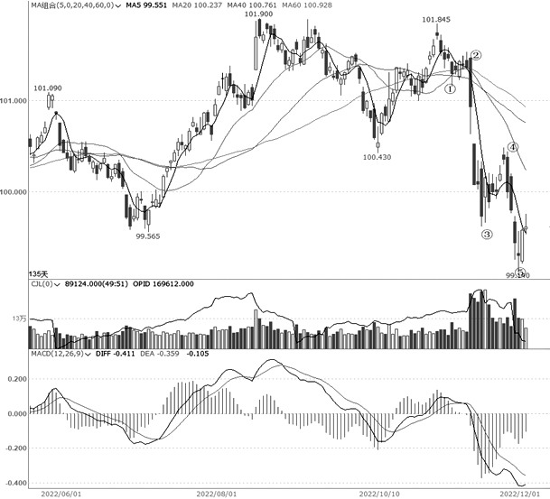 十債上周再度大幅下挫,自8月19日當周以來的雙頭形態頸線位100.5失守后,中期調整有望展開。日線上,11月11日展開快速下跌以來,小5浪走勢比較清晰,近3個交易日觸底反彈,期價收復5日均線壓力,有修復均線乖離率過大技術性反彈的可能。持倉成交季度萎縮,顯示空方進一步做空動能不足。綜合看,趨勢向下,短線存在修復反彈的可能。操作上,短線在5日均線不跌破前提下輕倉多單,待均線修復后,仍尋求阻力做空為主。(中原期貨 李衛紅)