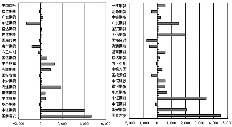 空頭前20席位中,增持空單的有14家。增持空單數量超過2000手的有4家,分別為國泰君安期貨席位、永安期貨席位、東證期貨席位和國信期貨席位,分別大幅增加4482手、2080手、3475手和2006手。另外,增持空單數量介于500手至2000手之間的有6家,分別為華泰期貨席位、銀河期貨席位、中信建投期貨席位、浙商期貨席位、廣發期貨席位和長江期貨席位,分別增加640手、539手、564手、550手、1528手和552手。剩余4家增持不足500手。