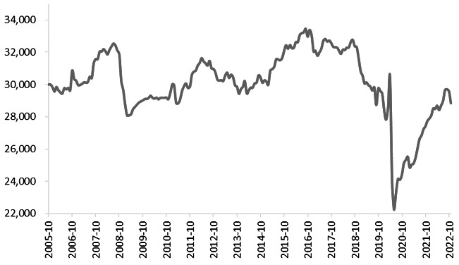 美國商業原油庫存變動可以反映一段時期內原油市場供需關系。在原油供需維持緊平衡格局下,2022年美國商業原油庫存保持低位,剔除季節性因素,無超預期累庫表現。不過從近期EIA庫存數據看,雖然原油庫存保持去化,但成品油庫存大幅增加,全口徑庫存實際上是回升的。按照往年經驗,每年年底至來年一季度原油需求相對偏弱,美國等北半球原油市場將迎來累庫階段,所以未來一段時間原油庫存數據難有亮點。