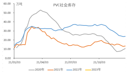 庫存上,PVC社會庫存上漲5.90%至25.86萬噸,社會庫存連續3周增 加,依然同比偏高56.25%。西北地區廠庫同樣環比增加,截至1月6日, 西北地區廠庫環比增加3.92%至28.15萬噸。?