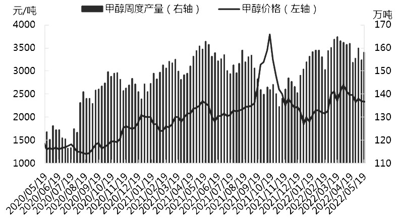 內地供應充裕。數據顯示,截至5月19日,我國甲醇周度產量為158.02萬噸,環比增加3.53萬噸,裝置產能利用率為78.34%,環比增加1.75個百分點。從周均產量情況看,今年周均產量達到158萬噸左右,同比增加10萬噸左右。短期來看,春季檢修季基本結束,后期甲醇裝置陸續重啟,內地供應不減。