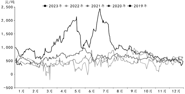圖為煤制甲醇毛利季節性走勢
