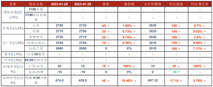 春節假期前一周以及假期間,市場交投氛圍較為冷淡,市場報價多延續平穩。節后開工,下游農業市場走貨增加,工業剛需適量補貨,市場有一定量的新單成交;目前廠家短時出貨較為順暢,春節前的預收訂單仍有一定的支撐。故節后價格出現一定程度調漲,節后市場需求有增加預期,主流區域尿素價格或仍有小漲空間。截至1月28日尿素市場價格及假期間變動情況如下: