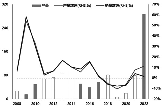 其次,重卡市場歷經一年筑底,未來邊際增量相對可觀。自2021年重卡國六標準全面實施以來,商用車產銷數據持續下行,單月產量和銷量不斷刷新最低紀錄。2022年,商用車生產318.36萬輛,同比縮減31.68%,同期銷量329.90萬輛,同比下滑30.98%。分市場來看,客車產量經過2021年的“小陽春”后重回負增長區間,占商用車銷量比例較大的重卡消費則陷入頹勢,連累2022年貨車產量增速。