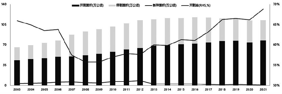雖然國內產區開割率有望得到維持,但是種植面積限制整體產出。近年來,國內橡膠新增種植面積每年在1萬—2萬公頃,相較2012年之前的種植浪潮下滑顯著,未來開割面積增速放緩。然而,2023年整體開割面積大概率維持平穩,停割面積繼續減少,開割率有望高位持穩。