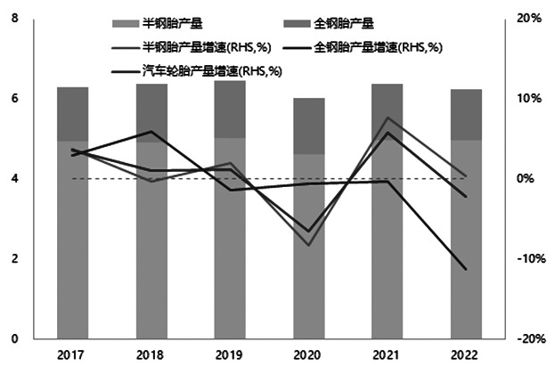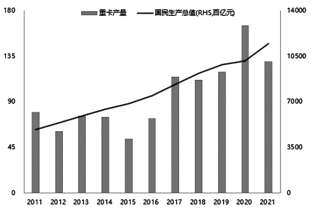 對比2021年貨車生產結構,以重型貨車、重型貨車非完整車輛、重型半掛牽引車為代表的重型卡車生產增速大幅下滑,其產量占比也同步縮水,使得商用車市場變成橡膠終端需求最大的累贅,完全沖抵了乘用車景氣上行帶來的消費釋放。究其根本原因,除重卡替換需求下跌外,還與經濟運行情況有關。實際上,重卡產量與經濟總量聯系緊密。2023年,多數省份將GDP增速目標設定在5.5%及以上,國內經濟復蘇預期強烈,這將大概率帶動筑底一年有余的重卡市場重整旗鼓,其增長幅度樂觀可期,同比增速可達20%,全年產量有望接近75萬輛,這也將有效帶動商用車產銷數據實現快速回升。