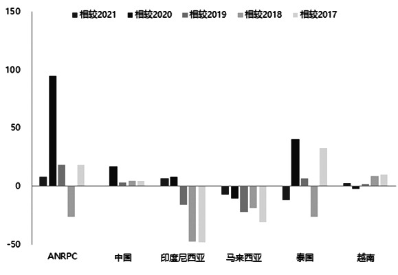 類似于國內產區,2022年泰國橡膠產出呈現前低后高之勢,氣候影響趨弱,原料釋放節奏明顯快于往年均值。2022年下半年,合艾市場膠水價格長期處于低位振蕩格局,但不同的是,橡膠產量增加并未同時提升國內到港泰膠水平的增長,泰國本地加工意愿走強或阻礙未來當地橡膠原料出口。