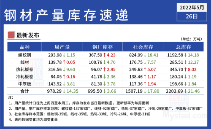 據Mysteel,截至5月26日當周,螺紋廠庫連續第五周增加,社庫連續第三周減少,產量、表需連續第二周減少。