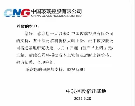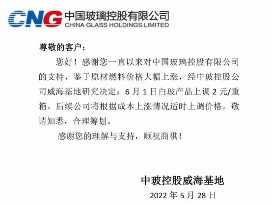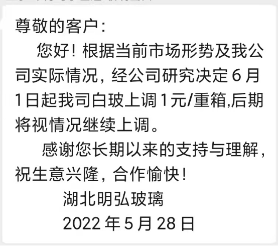 5月28日,湖北明弘玻璃、中玻控股威海基地、中玻控股宿遷基地、湖南巨強玻璃廠銷售部、吳江南玻玻璃有限公司等多家玻璃生產加工企業,對外發布了漲價函。