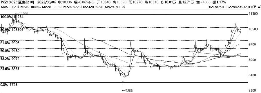 4月底以來,花生期貨主力2210合約在回調至黃金分割0.382對應的9070元/噸支撐后重拾漲勢。目前,價格漲至前高附近受阻回落。均線方面,均線呈現近似多頭排列走勢,但是短期5日均線下穿10日均線。指標方面,MACD指標死叉后發散,整體趨勢偏弱;KDJ指標、RSI指標處于低位有拐頭跡象,說明價格有超跌反彈的需求。量倉方面,近期的下跌伴隨著明顯縮量,說明下跌很大程度上是由多頭獲利了結所致,下跌動能并沒有明顯增加。因此,建議回調背靠黃金分割0.618對應的9900元/噸支撐位買入。(陳志翔 期貨投資咨詢證編號Z0001315)
