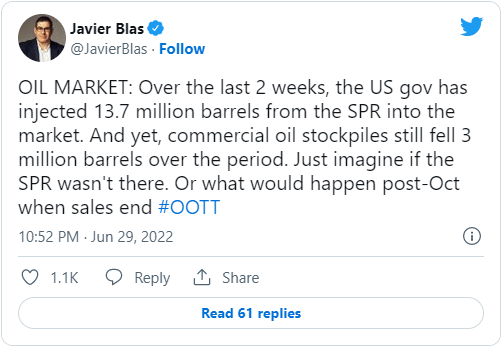 彭博的首席能源專家Javier Blas在上為這個可怕前景更是添了一把火。他指出,在過去的兩周內,美國政府釋放了137萬桶石油儲備,而美國商業原油庫存同期仍下降了300桶。