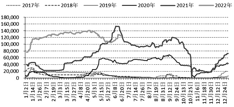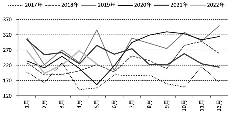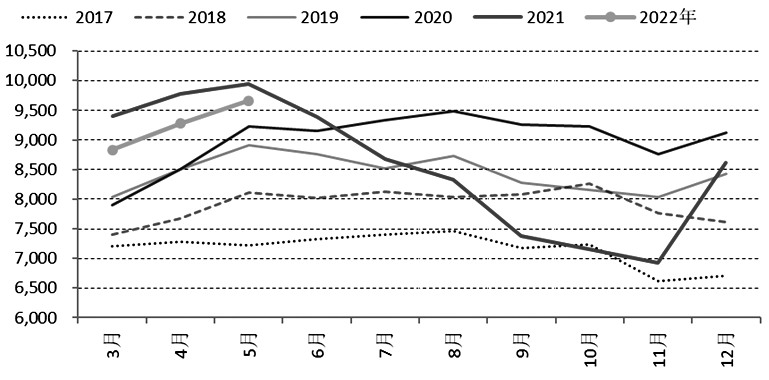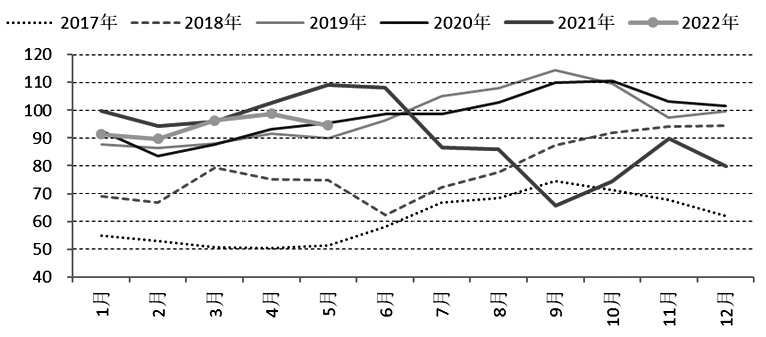 2022年5月,國內錳硅產量94.57噸,累計471萬噸,同比下降6.2%,錳硅產量降幅小于1—5月粗鋼產量7.9%的降幅,2022年上半年錳硅供給寬松。2021年硅錳月均產量91.02萬噸,按照2022年粗鋼產量同比不增、錳硅產量同比不增測算,6—12月硅錳月均產量不超過88.78萬噸。