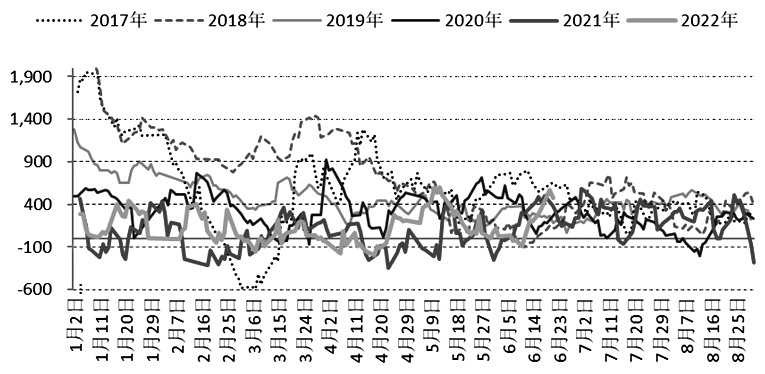 2022年,錳硅主力合約多次出現升水現貨,買現貨拋期貨的期現套利活動十分活躍。SM09基差主要在-200至500區間波動。
