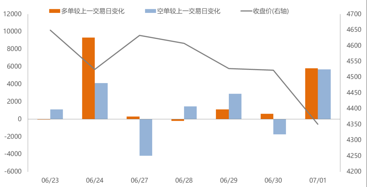 具體看國泰君安席位,在多數情況下多單持倉變化不大,且與空單持倉增減方向相反,但在6月24日、6月29日記7月1日多空同步增倉,且當日價格跌幅較為明顯。