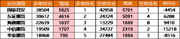 就多單而言,僅增倉超5千手,就空單而言,國泰期貨、東證期貨增倉超5千手。
