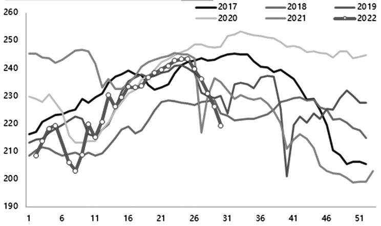 4月以來,國內鋼價累計下跌超過25%,鋼廠虧損范圍由短流程蔓延至長流程。截至7月22日,鋼聯口徑247家樣本鋼廠盈利比例已經降至9.96%,創下2016年供給側改革以來的新低。隨著鋼廠盈利的不斷收縮,6月中旬后,高爐主動減產意愿升溫。據不完全統計,6月15日—7月22日,全國陸續新增92座高爐檢修,影響日均鐵水產量31.97萬噸。截至7月22日,鋼聯口徑247家鋼廠日均鐵水產量降至219.24萬噸,較高點下降24.05萬噸,同比減少15.81萬噸。