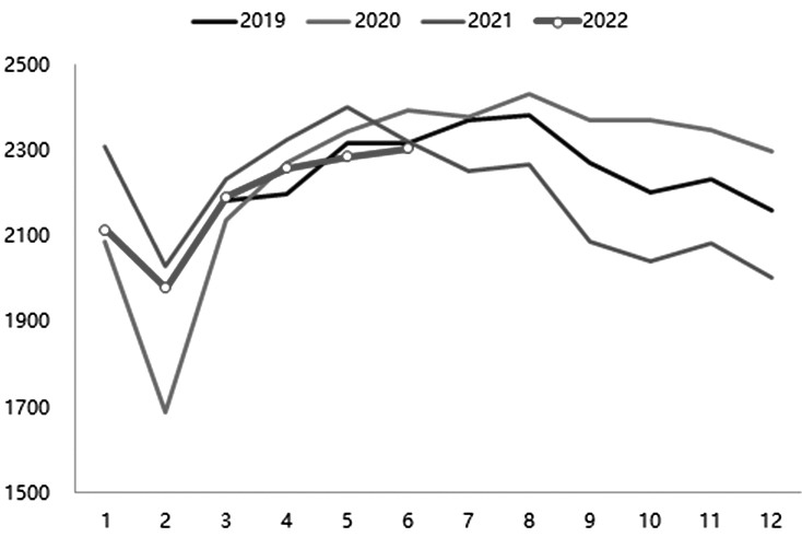 由于疫情影響,2022年上半年國產礦供應低于預期,鐵精粉產量同比減少486萬噸,降幅為3.6%。不過,隨著國內疫情的有效控制,礦山產量逐步恢復,6月,鐵精粉產量已幾乎與2021年6月持平。2021年下半年,礦山安全檢查趨嚴、能耗雙控等超預期的生產制約因素較多,鐵精粉產量基數偏低,而2019—2020年下半年鐵精粉月度產量基本穩定在2200萬噸以上,若2022年下半年鐵精粉月度產量保持2200萬噸,則下半年鐵精粉累計產量將小幅增加約500萬噸,全年產量就會與2021年持平。