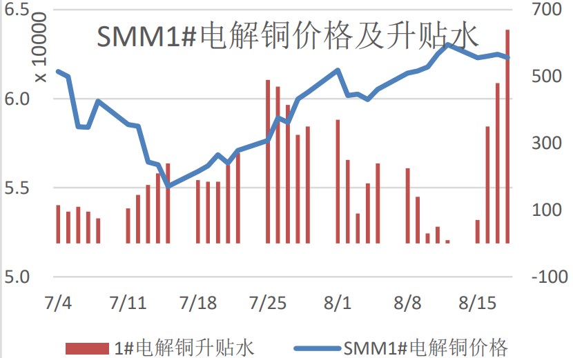 現貨緊缺,升水上探700元/噸望。SMM8月18日上海電解銅現貨對當月合約報于升水600~升水680元/噸,均價640元/噸,較前一日進一步上升160元/噸。